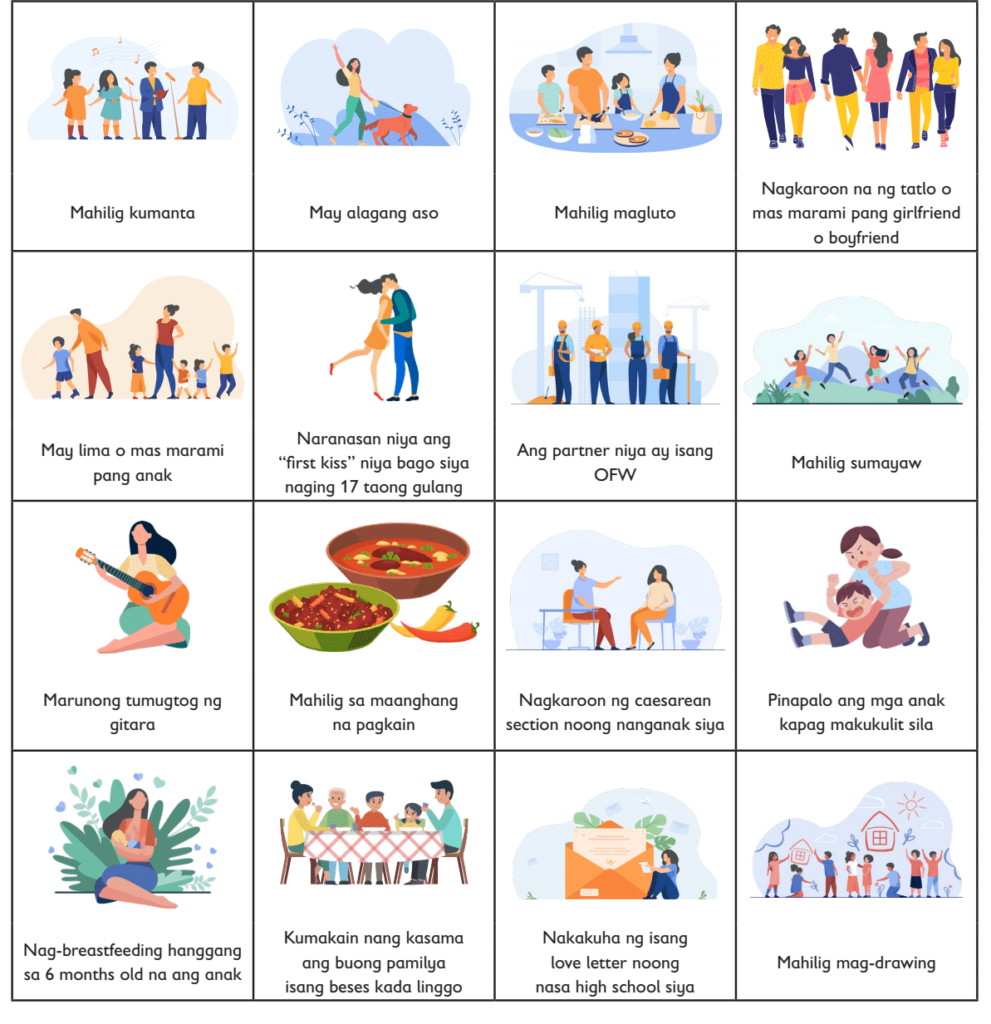 Bigyan ng isang Human Bingo sheet ang bawa’t participant. (Hinihikayat na lagyan ng drawing o larawan ang bawat hinihingi sa kahon.)